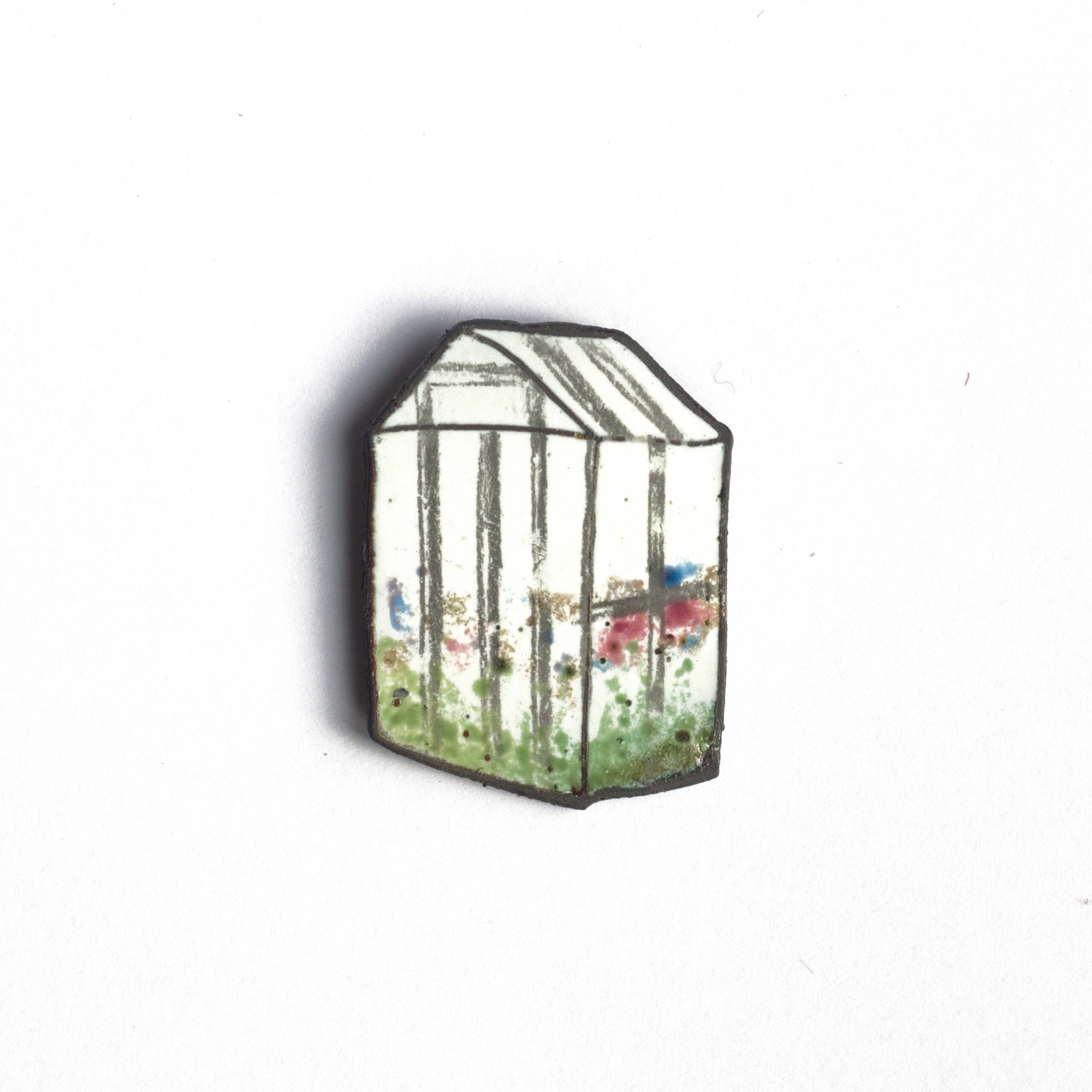 Handmade enamel pin with a metal base. The surface is coated with enamel and finished with graphite drawing. Fitted with a pin back for secure attachment.